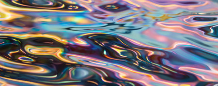 Abstract showing close-up of iridescent liquid surface with swirling rainbow colors and undulating wave-like...