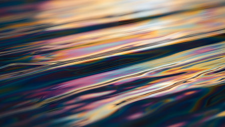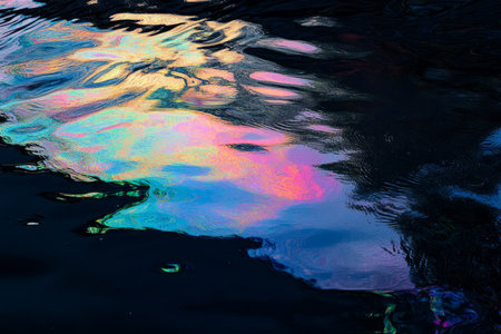 Reflective surface displays glossy petroleum with intricate textures and vibrant light interplay, showing a captivating spectrum of colors.
