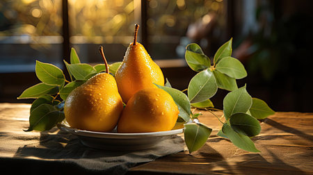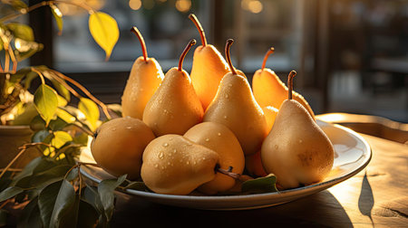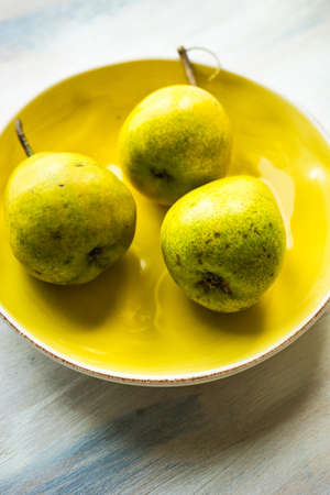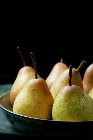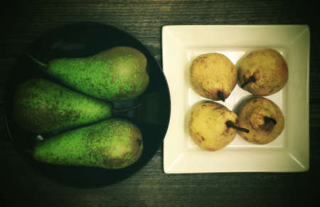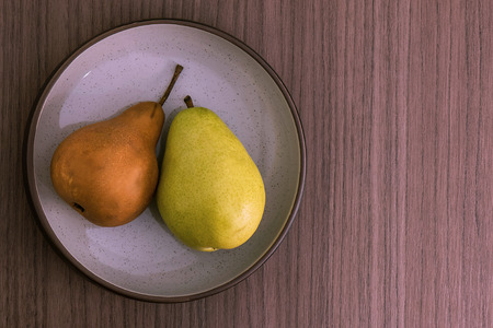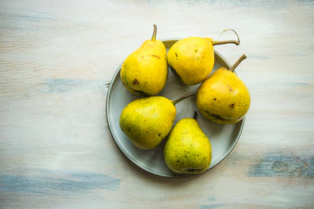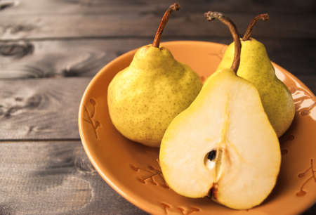 Organic pear fruits on the vintage plate on wooden background with copyspace