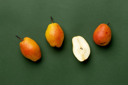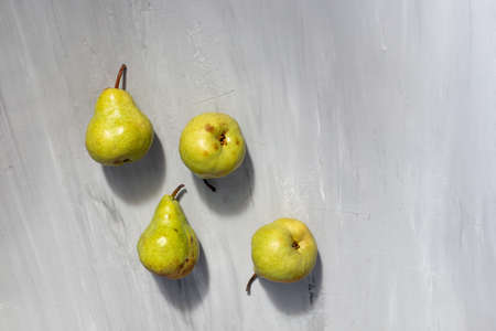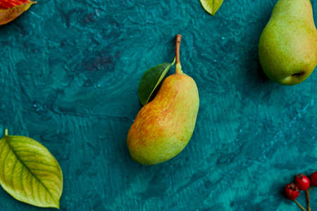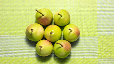 Ripe green pears on a table with a green surface. Top view, selective focus.