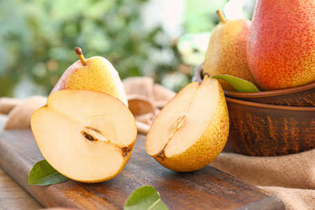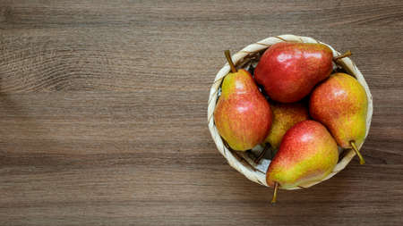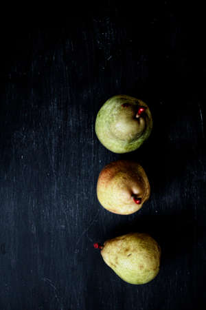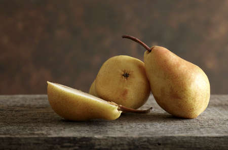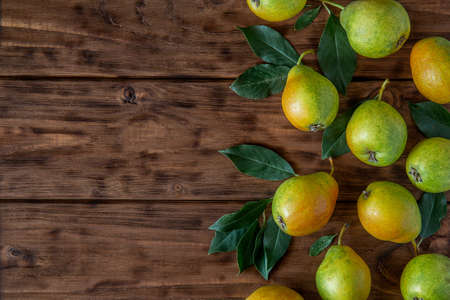 Fresh ripe organic pears on rustic wooden table, natural background, vega, diet food