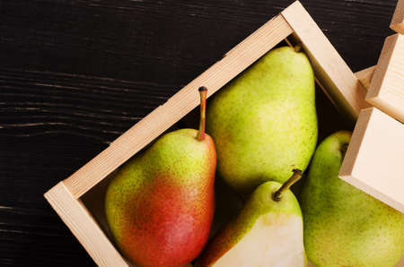 Red and green pears on a black background. Pears in a package from the store. beautiful fruits of pears. Diet healthy concept. Black background. creative summer concept. label design. nature concept.