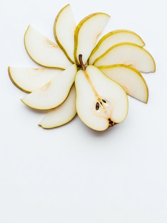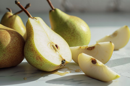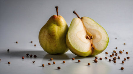 Fresh whole and cut pear on a white table with coriander seeds, creating a simple yet elegant composition