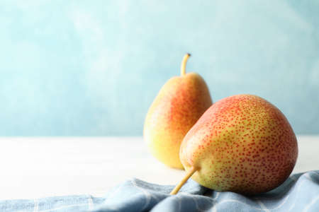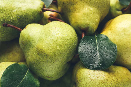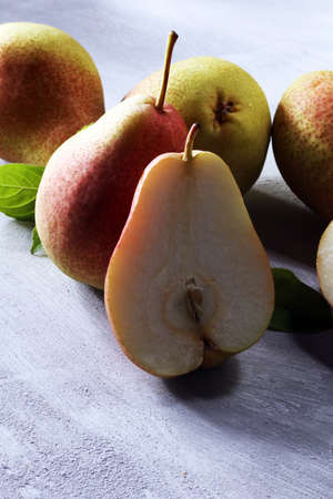 Many juicy beautiful amazing nice pears on light wooden background. Beautiful food art background.