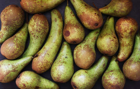 Ripe pears on the windowsill. Juicy pears are stacked in a row. Fruit harvest. Selective soft focus. Healthy organic food. Natural products.