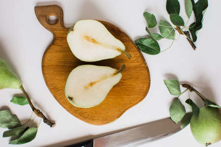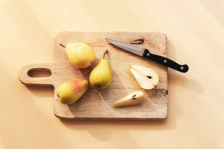 Fresh ripe pears and knife on wooden cutting board. Top view, flat lay.