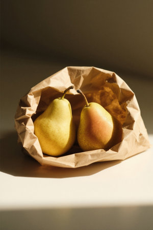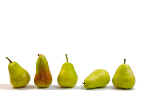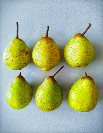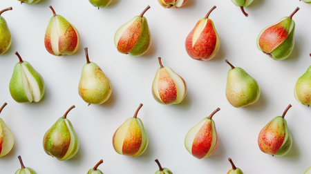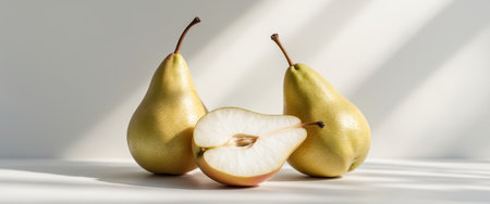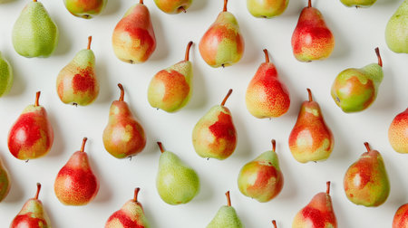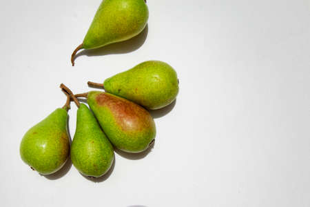 This photo captures the natural beauty of fresh pears in a realistic style, set against a white, flat-colored background. The front view highlights the pears' smooth texture and vibrant green color, making it perfect for various applications including culinary websites, food magazines, and health and wellness content