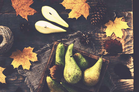 Fall decoration with yellow pears in rustic crate, maple leaves, pine cones on wooden background