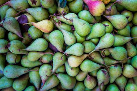 Juicy fruit background texture of yellow red ripe pears on market closeup.
