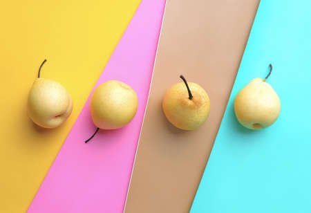 Flat lay composition with fresh ripe pears and space for text on yellow color background