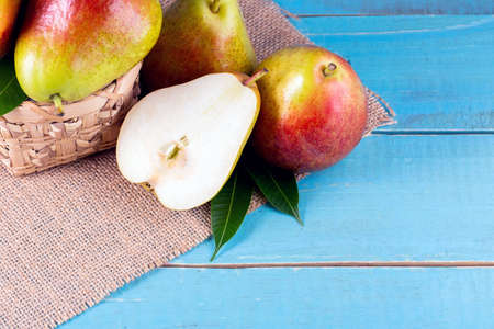 A Red battler pears or red pears on a blue cloth. Organic and natural products. Healthy food.