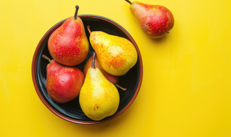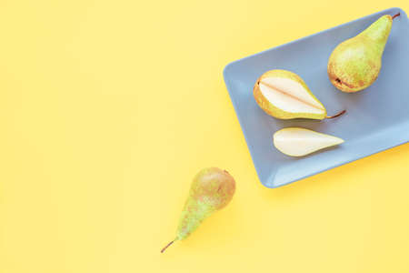 Ripe pears on gray plate on a yellow background, top view, flat lay.