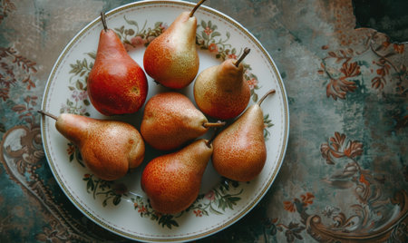 Fresh organic pears on vintage plate with rustic napkin on old wooden kitchen table