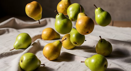 A creative studio shot of fresh green and yellow pears floating or falling against a neutral beige background. The dynamic composition and soft lighting highlight the smooth texture and organic shape of the healthy, levitating fruit.