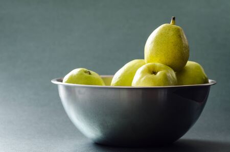 Six whole yellow Corella pears. Horizontal image with copy space.