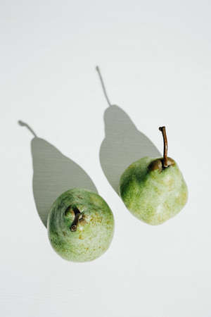 Two green pears minimalism, healthy food, vitamins and vegetarianism concept. Top view, flat lay