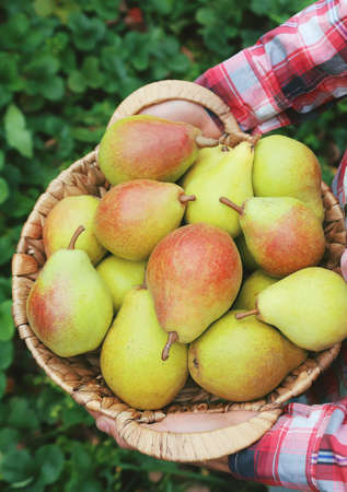 A man gardener holds a harvest of pears in his hands. Selective focus. nature.