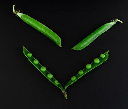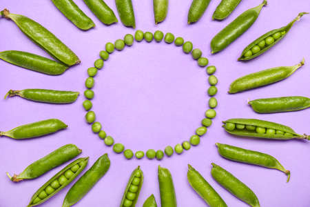 Pattern of fresh green pea pod with beans on kitchen desk. Top view