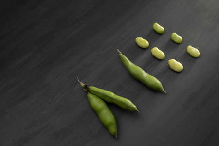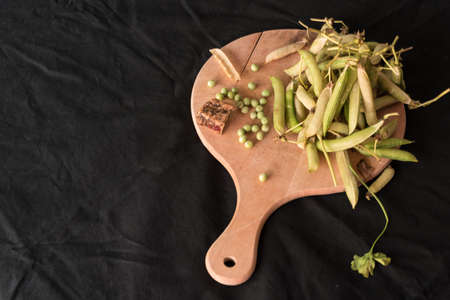 Peas, beans on wooden chopping board on a black background. Ingredients for pasta and peas. Italian food, Italian style.