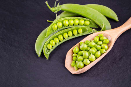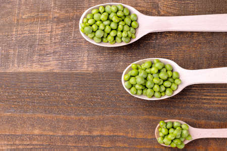 Fresh green peas in a wooden spoon on a brown wooden background. With place for inscription