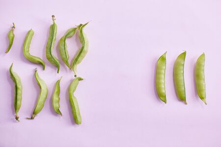 Ugly homegrown pea with a normal pea on a pink background. copy space