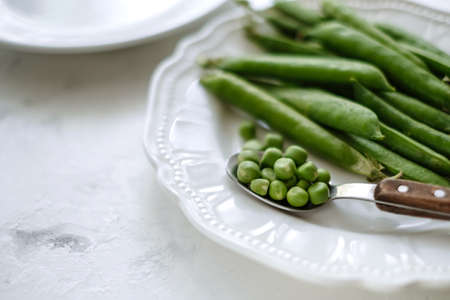 Fresh green peas on a white plate with a wooden spoon, close-up.