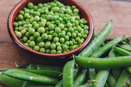 Close-up image of fresh green peas resting on a wooden surface. Water droplets enhance the vibrant color and freshness, showcasing natural beauty.