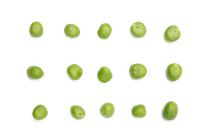 Cleaning fresh peas by hand top view, against white background. Close up of female opening green pod containers to remove the small edible seeds and place on a flat surface.