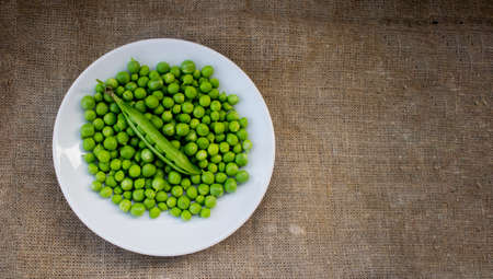 young green peas in a white bowl. pea pods on the background of old burlap . agricultural industry