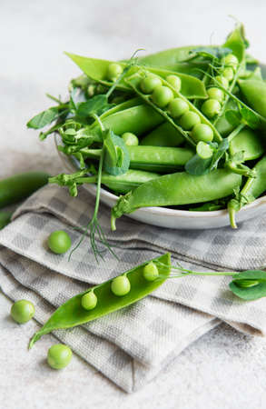 Fresh green peas pods and green peas with sprouts on concrete background. Concept of healthy eating, fresh vegetables.