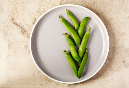 Pea pods in a white plate on a marble background. Healthy food and clean eating concept. Flat lay, top view, copy space.