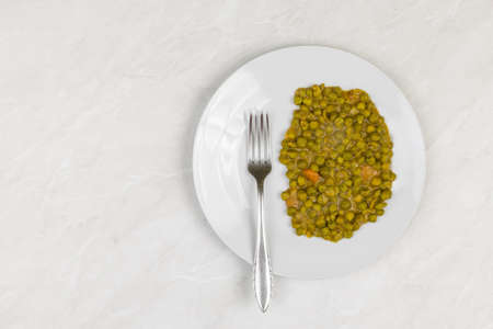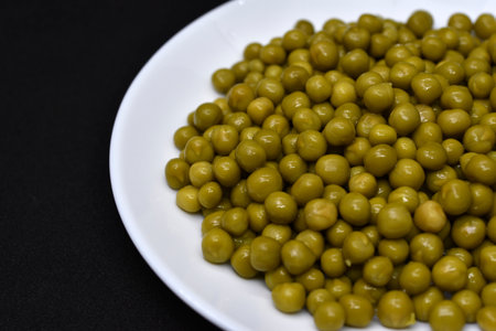 Canned peas on a white plate. Delicious fresh peas.