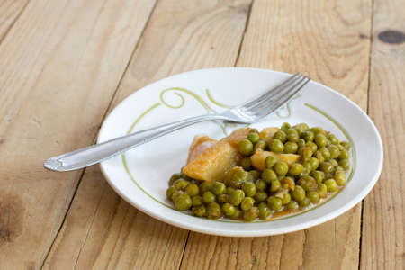 Cooked peas with potatoes on the retro old wooden table
