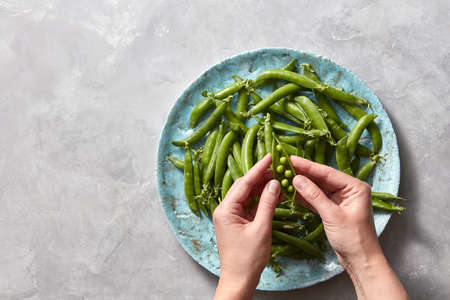Female hands open young pea sticks. Natural green vegetables for cooking healthy food on a gray marble kitchen table with place fot text.