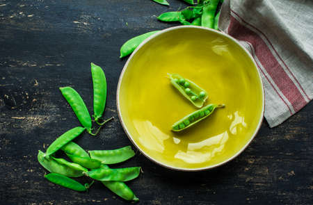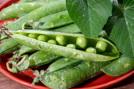 Organic gardening, harvest of green garden peas, fresh peas legumes pods, tasty vegetarian food