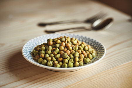 white plate with ready-baked chickpeas on a cotton vintage napkin and an old metal fork and spoon on a clean green background with scattered grains of raw chickpeas. Content for healthy eating.