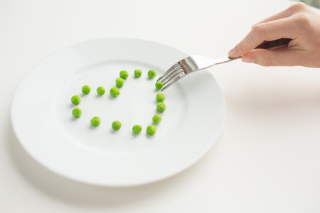 healthy eating, dieting, vegetarian food and people concept - close up of woman with fork eating peas in shape of heart
