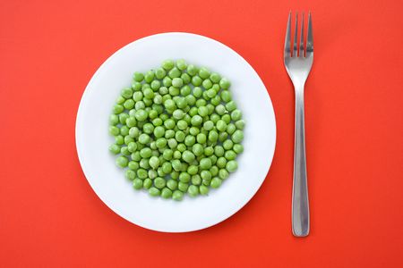 Fork approaching peas on white plate
