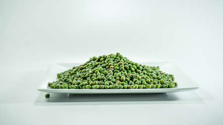 Green mung beans in white plate on white background.