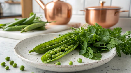 Fresh green peas and parsley on a plate on the kitchen table