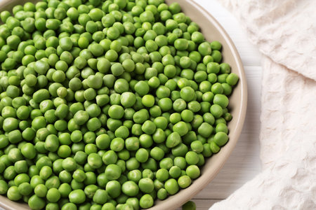 Fresh green peas in a white bowl, top view, flat lay