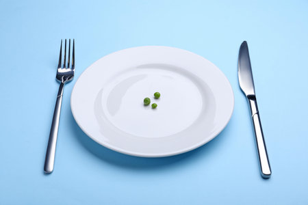 Three green peas on a plate, fork and knife on the table, diet and loosing weight concept, healthy lifestyle