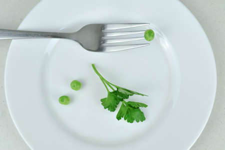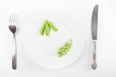 diet concept. Several peas lying on a white plate. Restriction in nutrition.