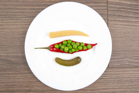 salad of pickled and pickled corn, peas, cucumber and red pepper on a white plate. food and vegetables. diet and weight loss
