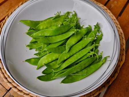 Green sugar snap peas placed on a white plate