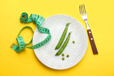 Plate with peas, measuring tape and fork on color background. Concept of anorexia