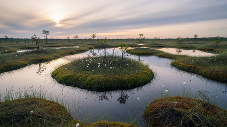 A tranquil swamp landscape at sunset with small islands of moss and cotton grass surrounded by calm water reflecting the sky.