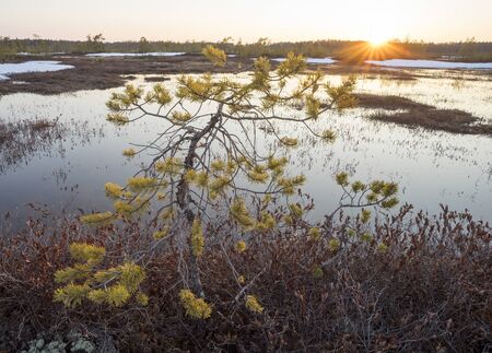 Spring landscape in the swamp. small swamp lakes, mosses and pines. small islands of swamp water. Spring Mars Landscape. Small Lake with Swamp Islands.