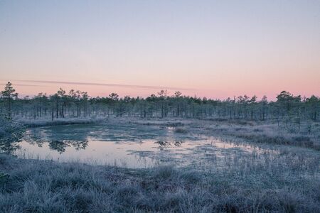 A beautiful morning landscape in a frozem swamp. A small swamp ponds in autumn. Quagmire un wetlands with reflections. White frozem grass.