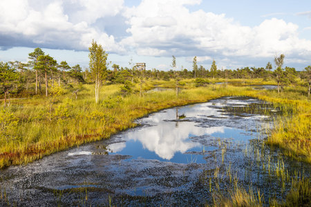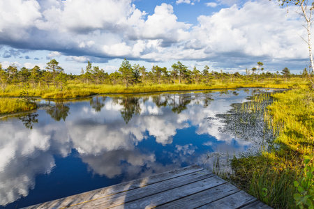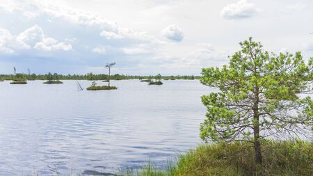 sunny summer landscape from the swamp, white cumulus clouds reflect in the dark swamp water. Bright green bog grass and small bog pines on the shore of the lake. Nigula bog, Estonia